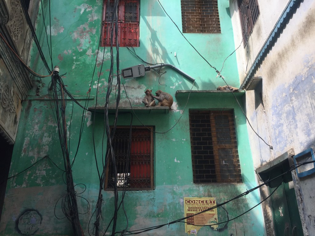 Questo luogo, che già nel nome porta inscritta una sua spontanea accezione, assumerà il ruolo iniziale di pensione a basso costo, per poi divenire nostro rifugio, spazio di ricerca a ridosso della dichiarazione di lockdown e, in un avanzare privo di indugi, luogo di confino speciale durante l’eccezionalità sancita dalla costrizione indirizzata agli stranieri ancora presenti in città e in particolar modo in quel quartiere. Sollecitati dal dedalo di viuzze che avevamo attraversato e arrivati all’incrocio con il vicolo cieco che conduceva all’ingresso, cercammo di memorizzare visivamente il posto per ritrovarlo più tardi, una volta posati gli zaini, dato che lo stratagemma suggerito da Arjun per orientarci (seguire i mattoncini piccoli del selciato) non ci era sembrato sufficiente, tante erano le varietà di mattonelle e pietre che ricoprivano quel puzzle di angoli, croci e stradine. Sulla sinistra si trovava il cancello di entrata al Chausatti Devi Temple, dipinto di un giallo sole brillante, poco distante un bidone della spazzatura il cui contenuto era stato completamente rovesciato dalle scimmie, generosamente consegnato alla pavimentazione e ai cani, di fronte si intravedeva un piccolo linga e, proseguendo, l’arcata che conduceva al ghat, infine sulla destra dipinta all’angolo del muro si poteva leggere, con un pò di fortuna, l’insegna dell’Ashram Guest House che faceva capolino fra i numerosi fili della luce. I cavi elettrici, intrecciati come capita di vederli nelle cittadine del subcontinente, agglomeravano disordinatamente e senza interruzioni un edificio all’altro: segno di uno spazio arrangiato dal passare del tempo e dalla mano dell’uomo, di una gestione quanto meno caotica della fornitura di energia elettrica e di passaggi sospesi per le scimmie. Non solo liane urbane partecipi dell’ecosistema cittadino, bensì infrastruttura imprescindibile di quell’habitat metropolitano, necessaria agli spostamenti aerei e trasversali dei primati che in tempi normali, evitando l’irritante calata a terra, dividono più o meno conflittualmente la città con l’essere umano, mentre durante la serrata pandemica, scendendo con più frequenza dai cavi, gliela contendevano con sempre maggiore aggressività1…